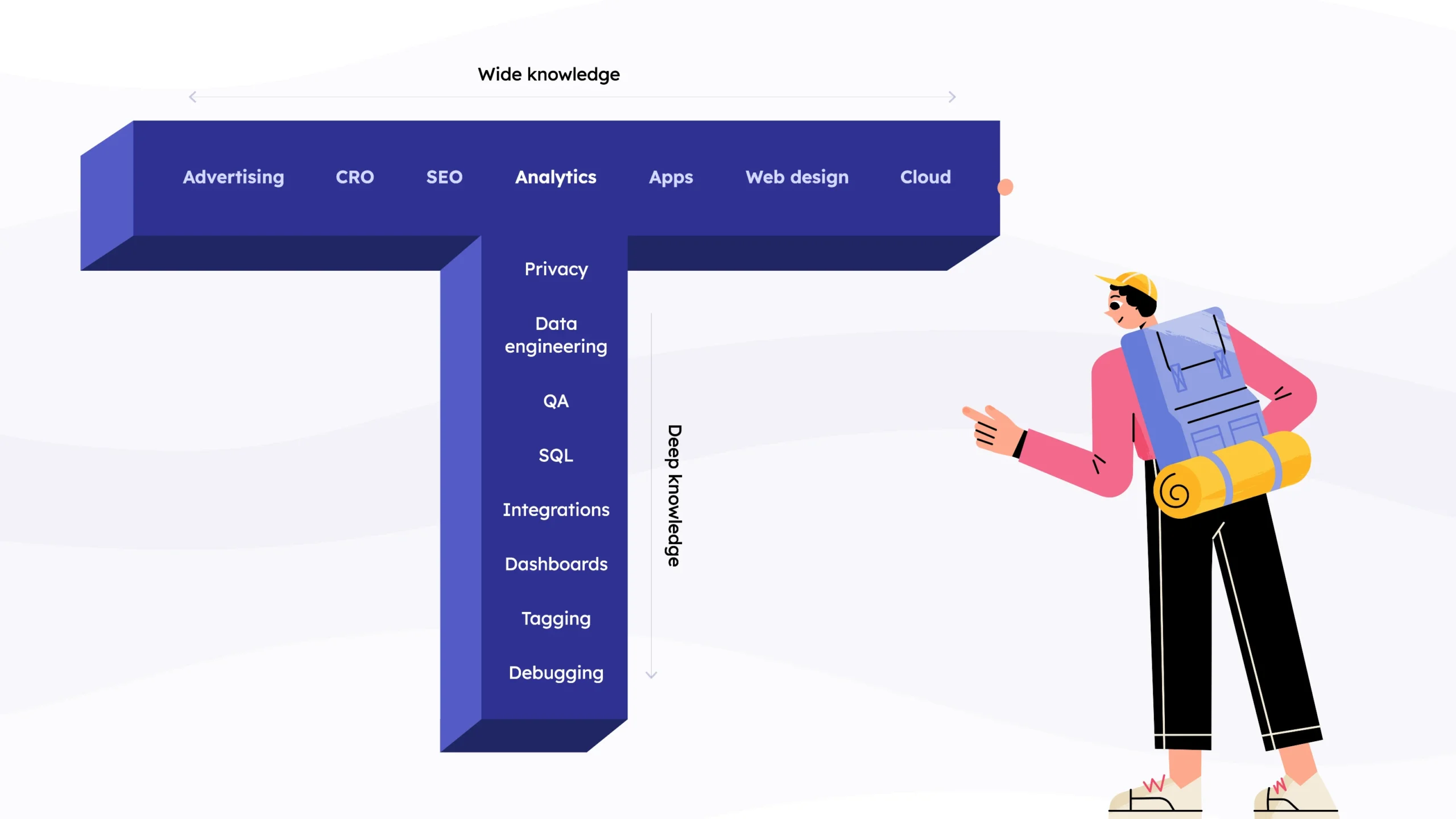 Technical marketers usually have a T-shaped learning profile, meaning that they have deep knowledge of a few specific areas (the vertical bar of the “T”) and superficial knowledge about other topics within their field (the horizontal bar of the “T”).